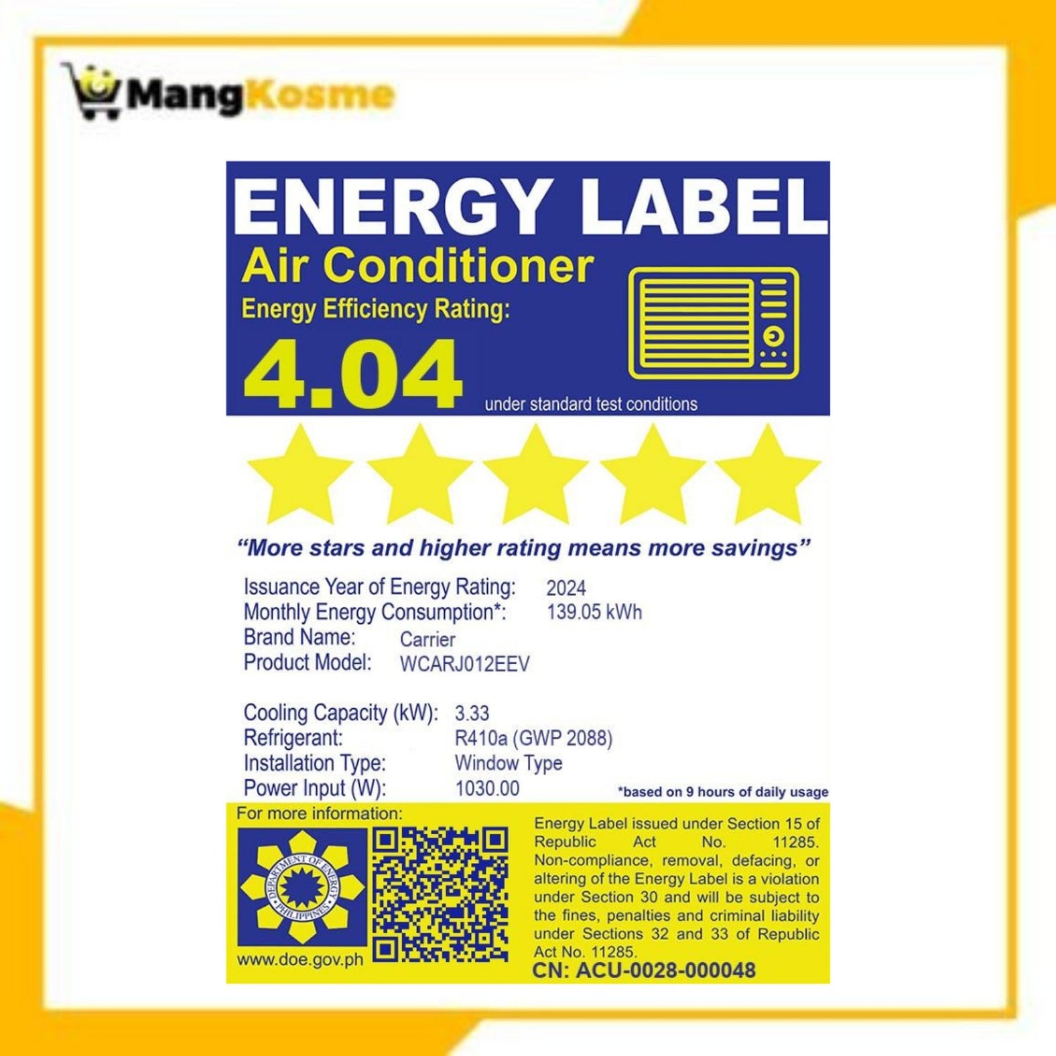 Upgrade your cooling game with the Carrier 1.50 HP Remote Aura, Window-Type Inverter Air Conditioner! Enjoy ultimate comfort with its High EER and Inverter Technology, while its sleek and modern design adds to your home's aesthetic. Say goodbye to high energy costs with its energy-saving features such as the 24hr timer, Econo and Sleep Mode, and Energy Savings Plug. Keep your air clean and fresh with the 8-in-1 Filter Technology and R410A Refrigerant. Live in luxury with this top-of-the-line air conditioner!
