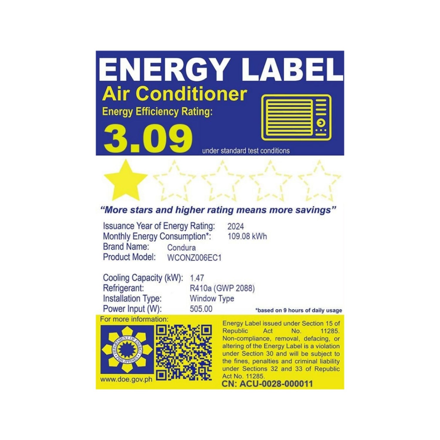 Product Description: Condura 0.5 HP Standard R410A SM CMG1 Window-Type Air Conditioner (Class A)